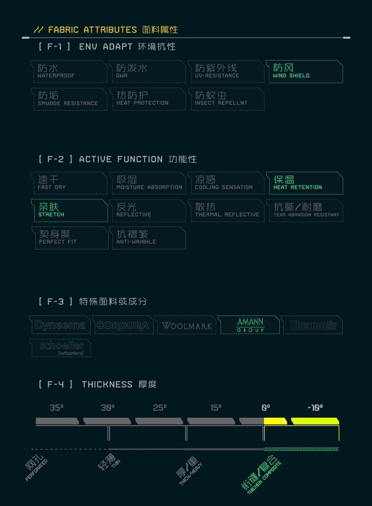 部分服裝布料採用EDGEO-TEX — WaxTech™挺括質感布料。