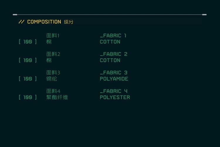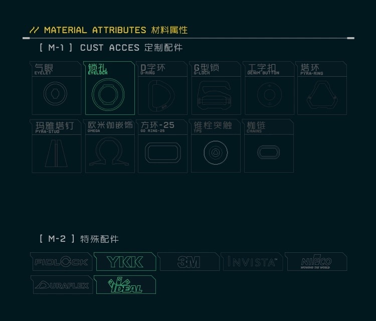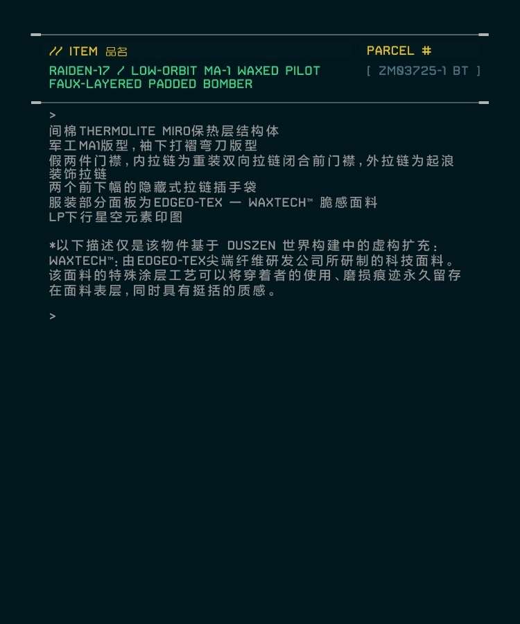 WaxTech™:由尖端纖維研究公司EDGEO-TEX開發的高科技面料。布料採用獨特的塗層工藝,可將穿著者的使用痕跡和磨損印記永久保留在布料表面,同時保持挺括的質感。
