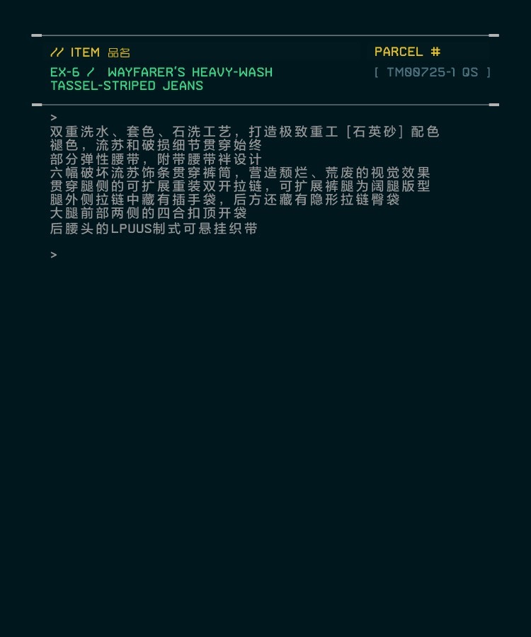 _六條破損流蘇條帶沿著褲管向下延伸,營造出頹廢的視覺效果。